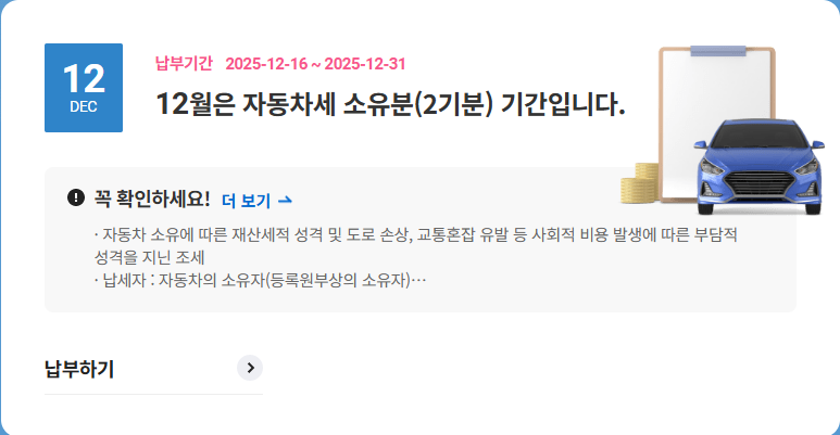 - 12월 자동차세 : 12월 16일 ~ 12월 31일